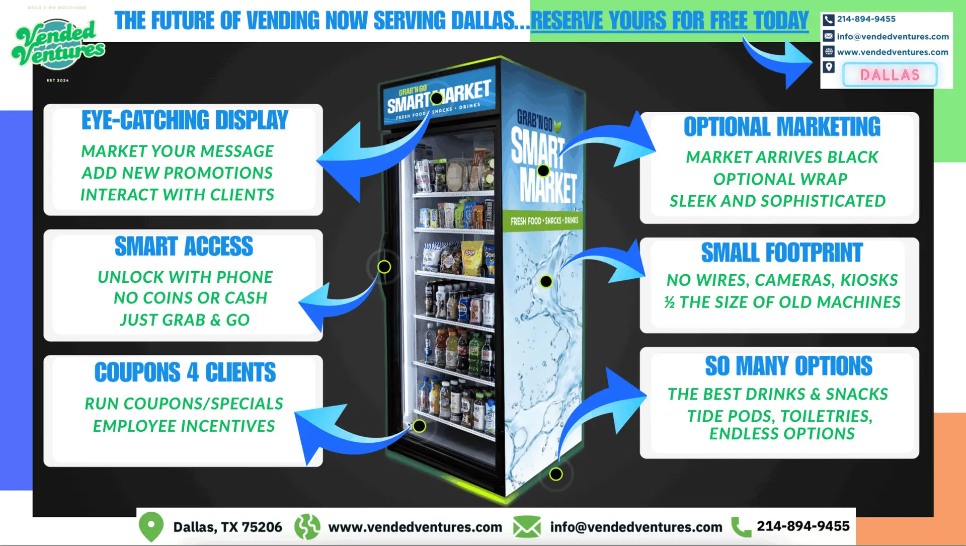 Smart Market replaces bulky and outdated mechanical vending machines with sleek and modern technology. No cameras, wires, or kiosks means ZERO out of pocket costs for the business. Just plug Smart Market in, and let the AI technology monitor security, payments, and create a seamless Grab & Go experience. Healthy meals, snacks, drinks and more all with your Smart Phone.